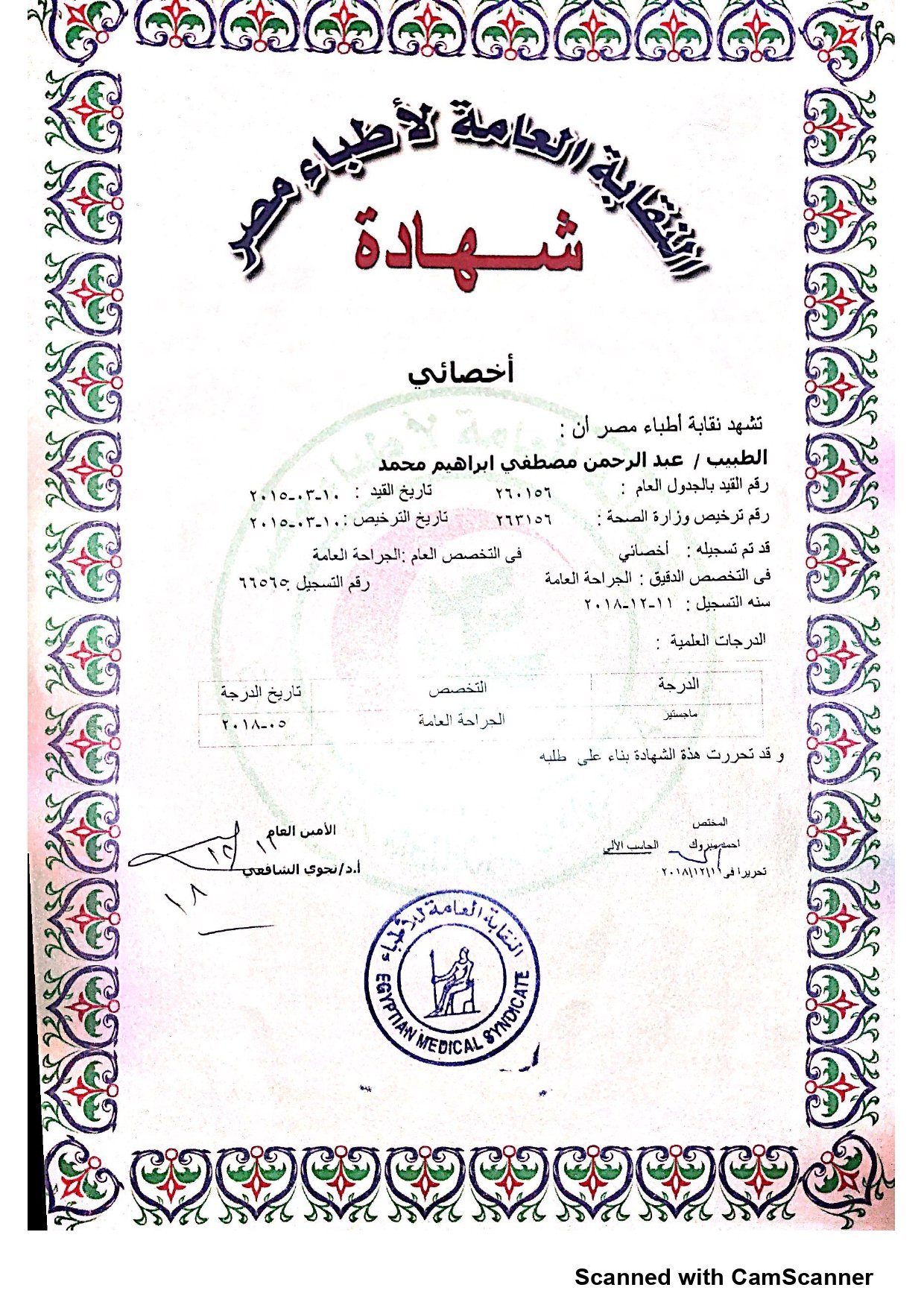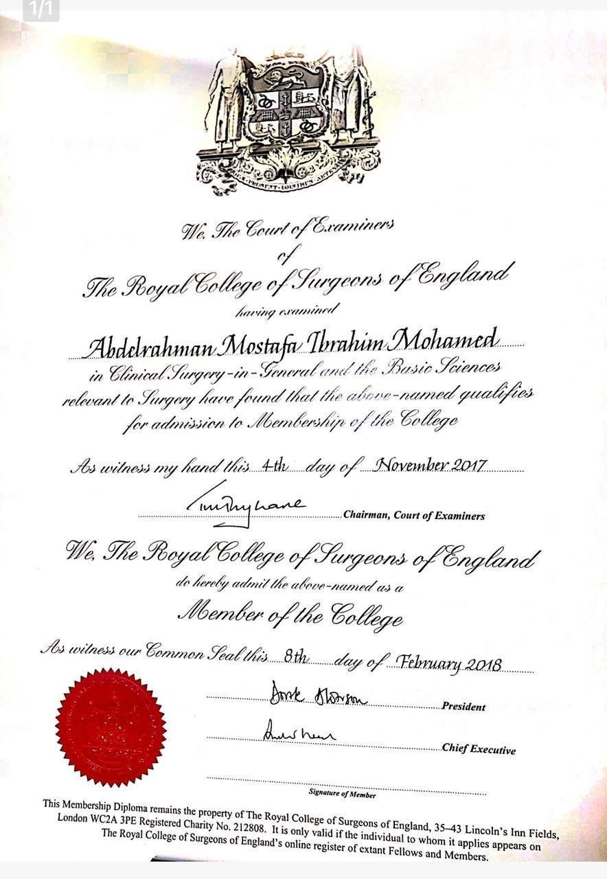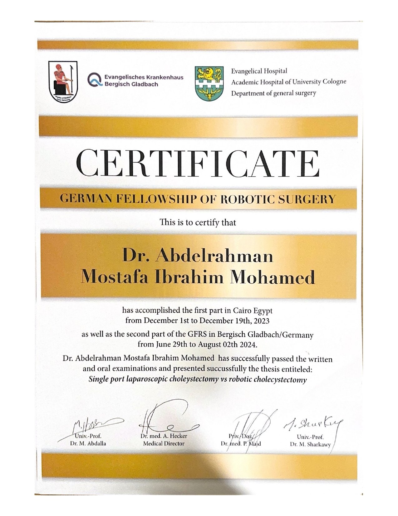 حاصل على زمالة جراحات المناظير المتقدمة والروبوت – جامعة كولن، ألمانيا