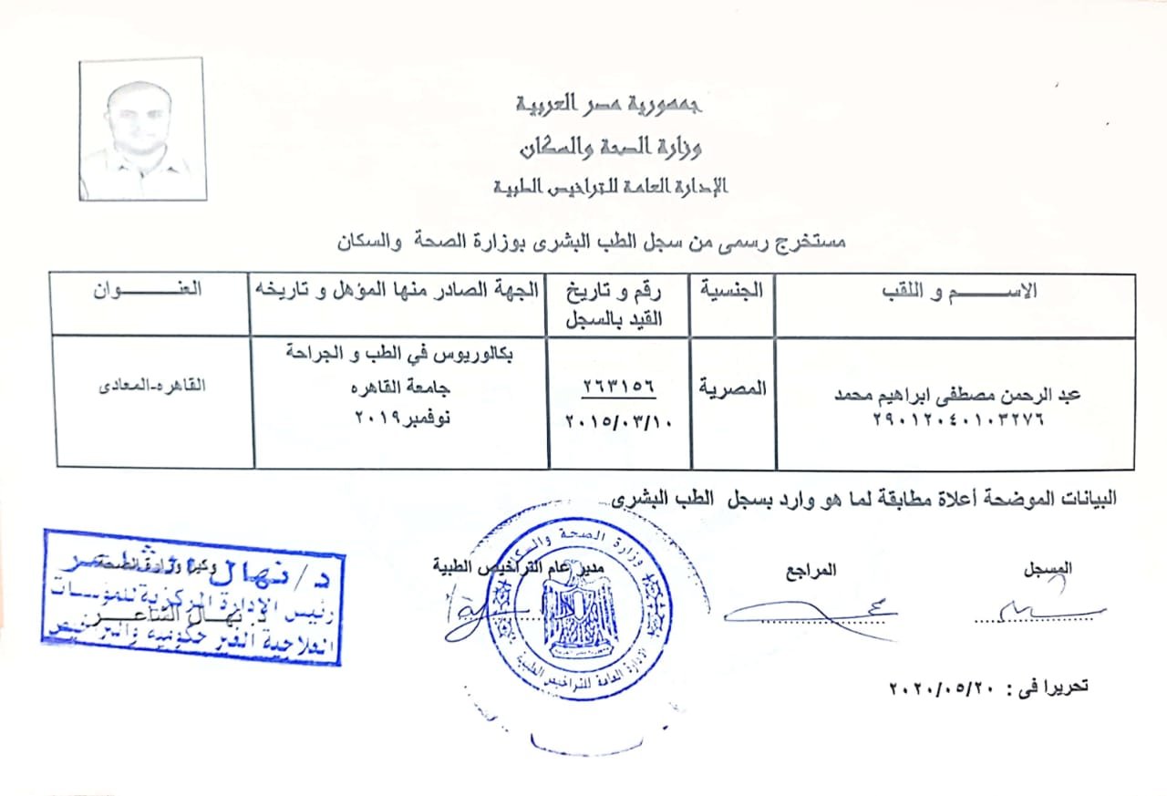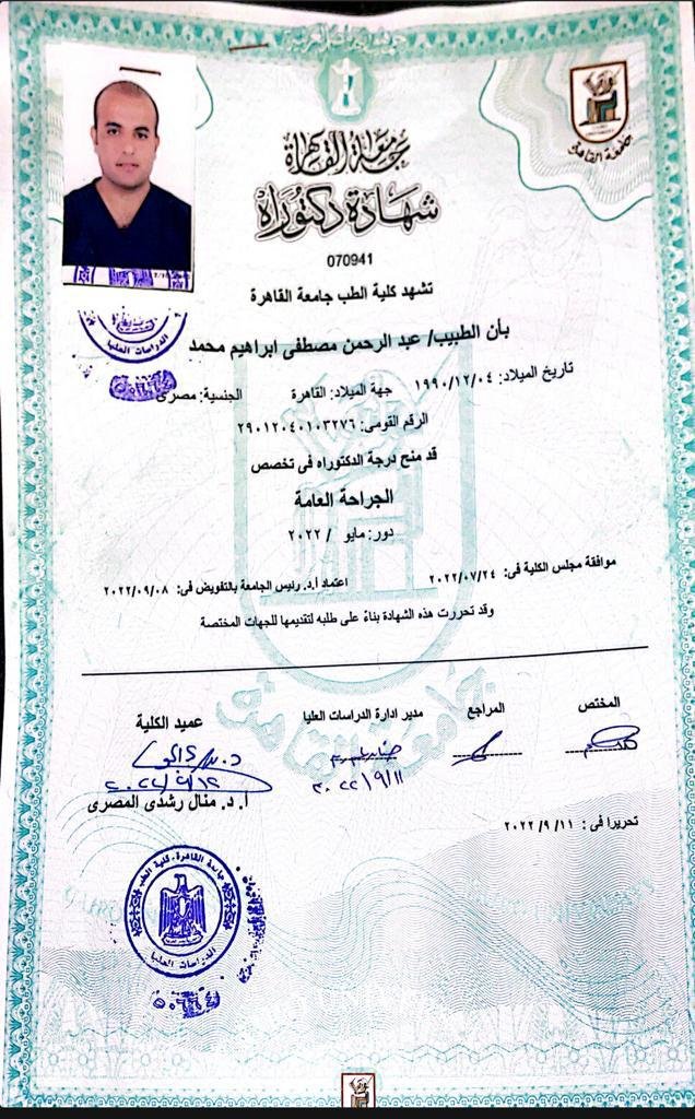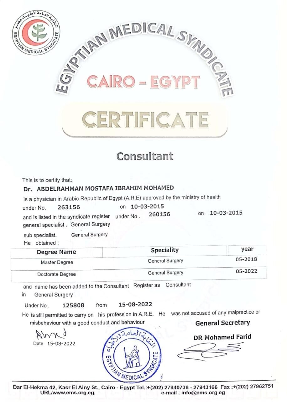د. عبدالرحمن مصطفى مدرس واستشاري الجراحة العامة وجراحات المناظير المتقدمة والسمنة، يتمتع بخبرة واسعة في إجراء الجراحات الدقيقة باستخدام أحدث التقنيات الطبية، مع التركيز الكامل على أمان المريض وجودة الرعاية.